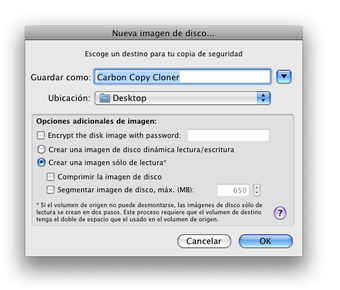 Seleccionas el disco a copiar y el de destino, local, externo o en red, y Carbon Copy Cloner (CCC) hará una copia exacta. Ideal para proteger ficheros o para copiar tu sistema en otro equipo.